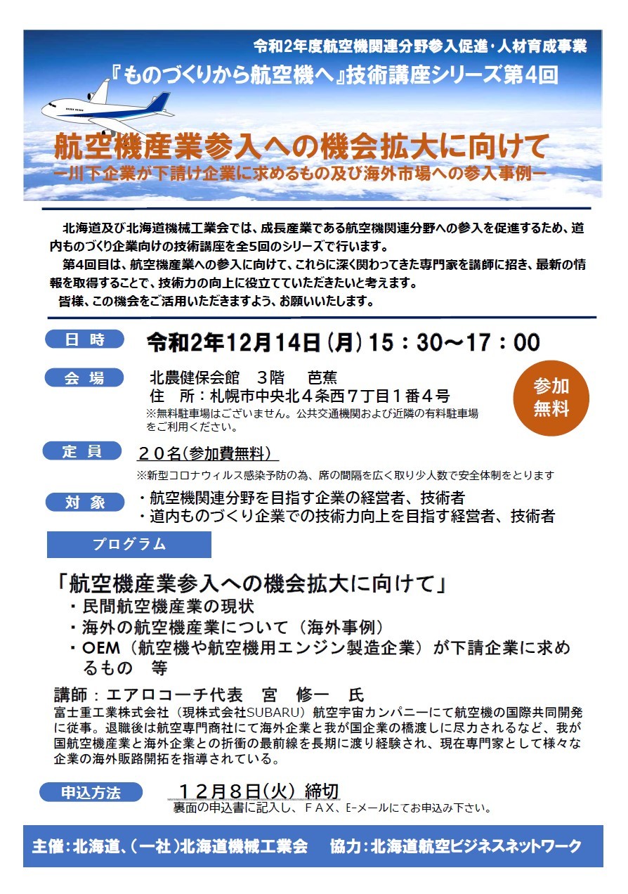 北海道及び北海道機械工業会では、成長産業である航空機関連分野への参入を促進するため、道内ものづくり企業向けの技術講座を行っており、第4回目は、航空機関連分野を目指す企業の経営者、技術者・道内ものづくり企業での技術力向上を目指す経営者、技術者を対象としたセミナーをエアロコーチが受託し、2020年12月14日(月)北農健保会館にて実施しました。