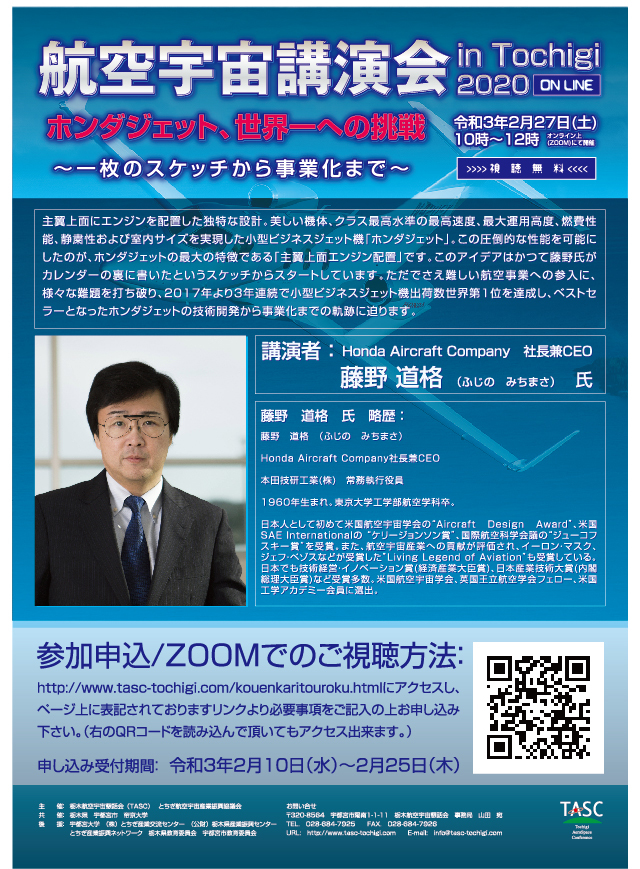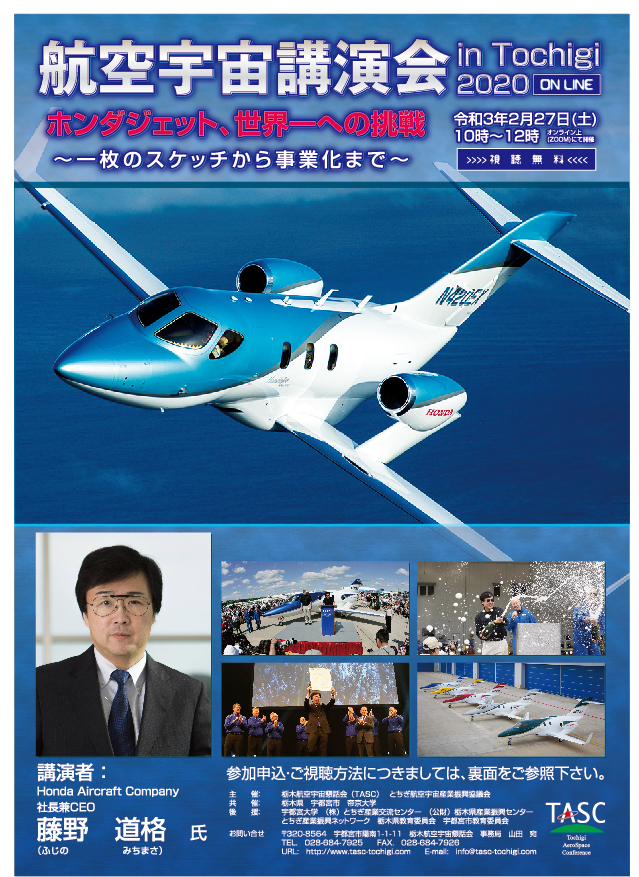 この度、栃木航空宇宙懇話会(TASC)並びにとちぎ航空宇宙産業振興協議会の主催による『航空宇宙講演会 in Tochigi 2020』を、下記の通り【オンライン形式】にて開催する事となりました。