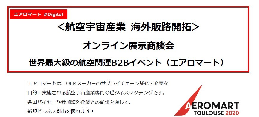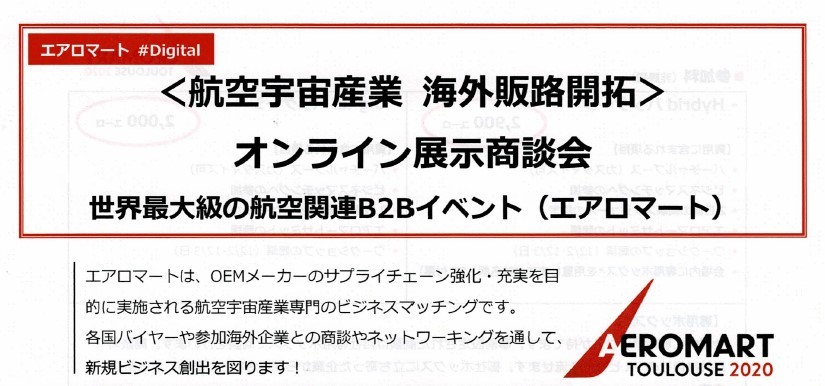 2020年12月1日(火)~3日(水)の間、エアロマートトゥールーズ2020が開催されました。この時期、世界的な新型コロナ感染拡大の影響が大きく、全面的WEB展示及びミーティング開催となりました。